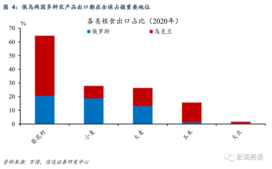 全球粮食危机来源于极端天气、俄乌冲突、出口禁令和成本推升四个因素。一是拉尼娜现象引发的旱涝极端天气使得美国、巴西等全球主要的粮食出口国粮食产量下滑。二是俄乌两国多种农产品出口都在全球占据重要地位,2020年两国葵花籽及葵花籽油出口合计占全球约65%,小麦出口合计占全球约27%。由于俄乌冲突的持续,两国粮食的生产和出口受到了严重的影响。三是为了缓解国内价格上涨和供应短缺情况,3月以来有20多个国家先后出台了粮食出口禁令,品类包括小麦、玉米、面粉、西红柿、植物油、豆类等。粮食出口禁令导致国际粮食供给格局愈发紧张。四是全球范围的能源价格飙升推升粮食生产成本。原油、天然气等能源价格上涨一方面直接推升了粮食的生产和运输成本,另外还会通过产业链传导影响化肥价格。此外,俄罗斯对化肥的出口限制进一步增加了肥料的稀缺性。